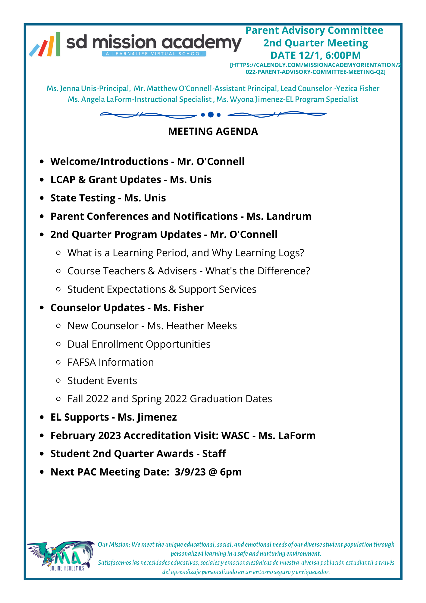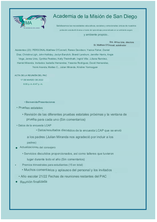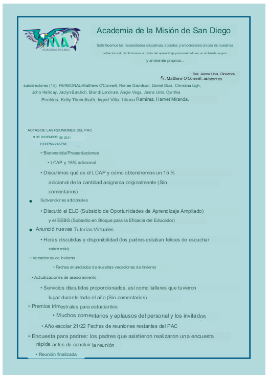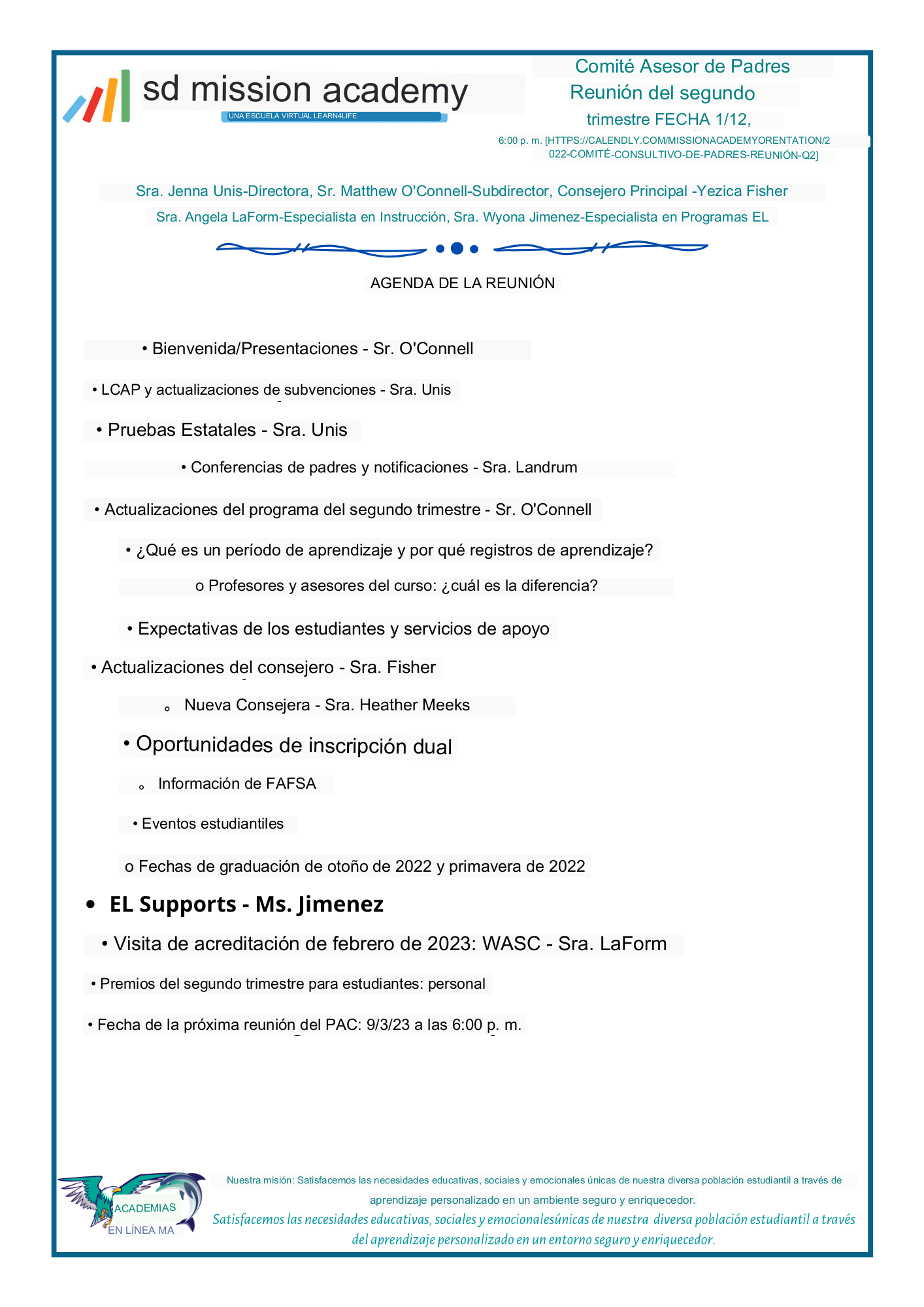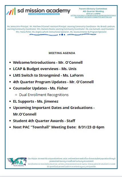 | April 28,2023 | 6:00pm | Agenda – [English] & [Español] Minutes – [English] & [Español] |