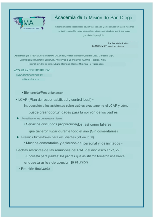 | September 23, 2021 | 6:00pm | Agenda – [English] & [Español] Minutes – [English] & [Español] |