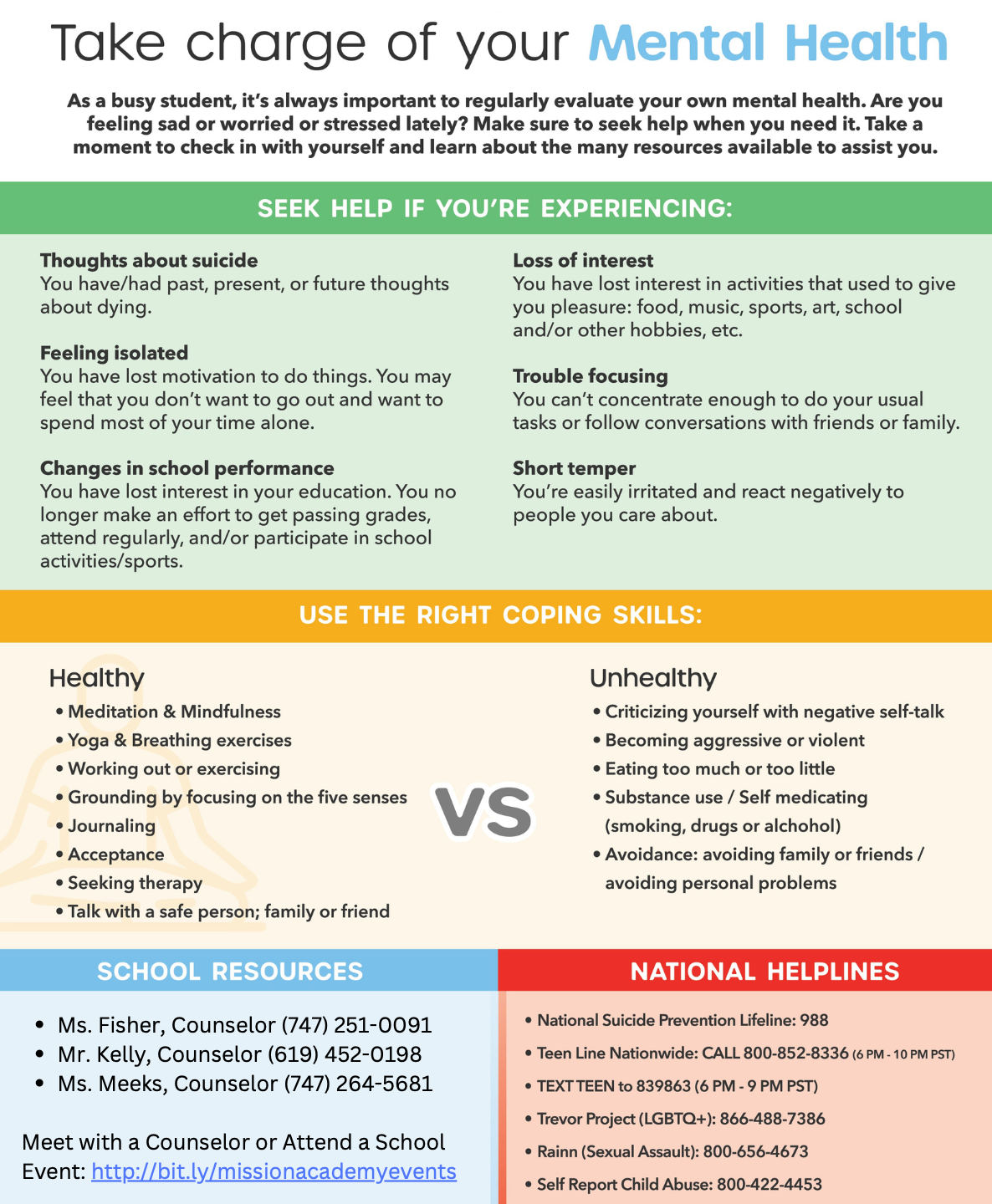 Per Education Code Section 48980 (AB 2022), we are required to notify you in writing on the ways to access mental health services and the resources that are available to you on campus and/or in the community. The mental health of you/your student is very important to us and as always, we are ready to work with you to assist in addressing the social-emotional needs or concerns of your student. Below are local resources that may be available to you and your student should the need arise. Please keep us informed as appropriate so that we can assist you in caring for and providing services to your student.